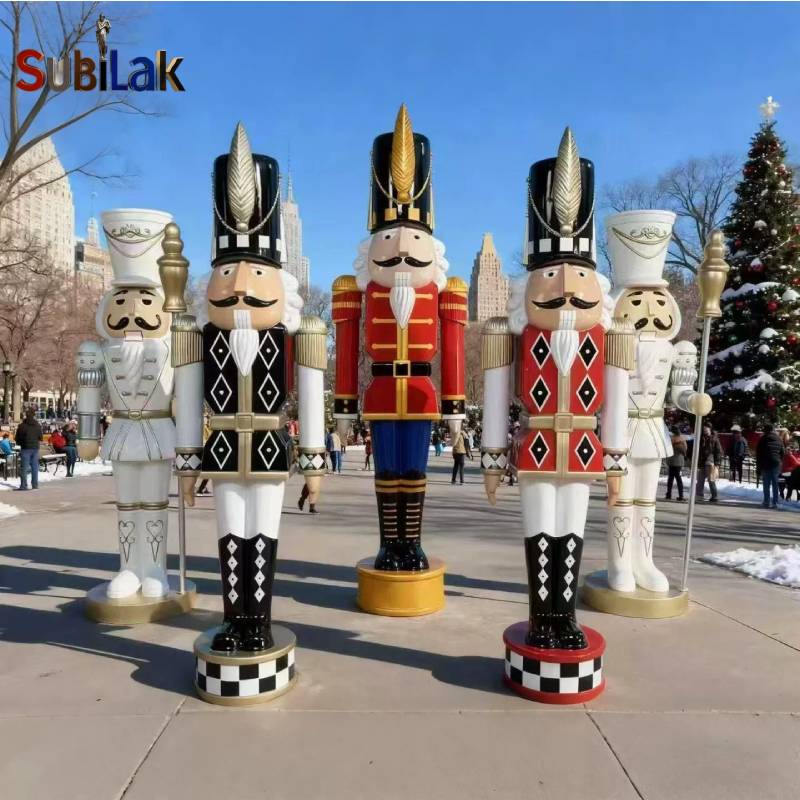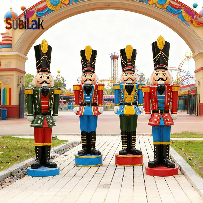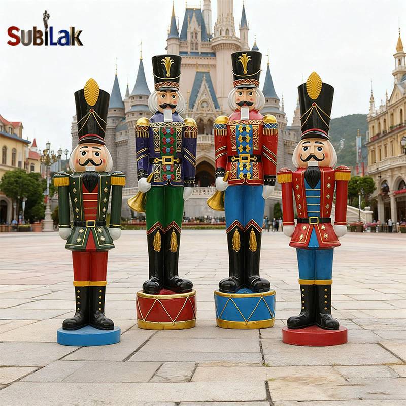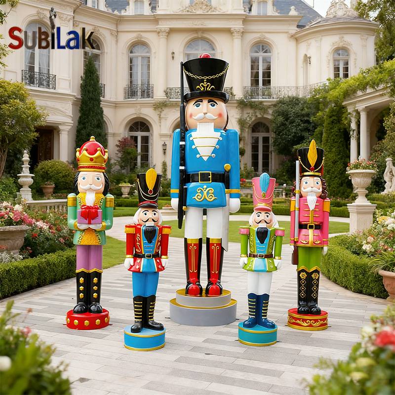 This image shows a group of brightly colored fiberglass statues of Nutcracker soldiers, which are neatly arranged in a courtyard in front of a magnificent European-style building. The statues are dressed in different colored uniforms with different postures, with neatly trimmed greenery and fine architectural details in the background, giving an overall fairytale-like dreamy atmosphere.