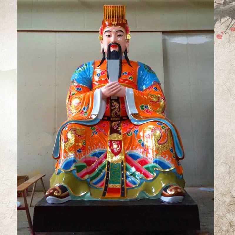 This is a statue of the Jade Emperor made of fiberglass. With its lightness and plasticity, fiberglass is an ideal carrier for the sculpture of gods. When making it, the prototype is first outlined with clay sculpture or 3D modeling, and then the fiberglass raw material is injected into the mold after the mold is turned over. After solidification and demolding, it enters the stage of fine carving. The craftsman uses the carving knife as a pen to depict the flowing rhythm of the folds of the clothes, and uses the painting process to lay out the clothes with bright colors. The patterns such as auspicious clouds and dragon patterns are abstracted to break the constraints of realism. Between the collision of colors and the outline of lines, the statue is given an extraordinary atmosphere.