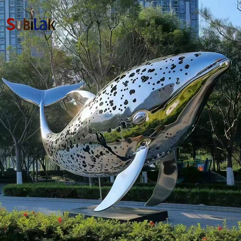 This picture shows a stainless steel whale statue, which embodies the spirit of craftsmanship from the material and craftsmanship to the on-site environment.